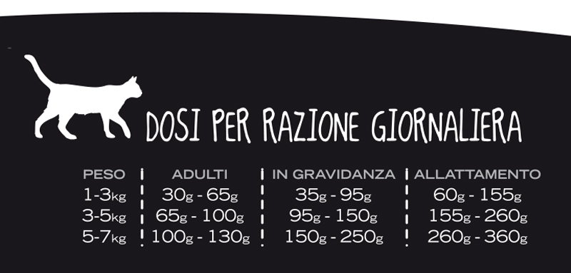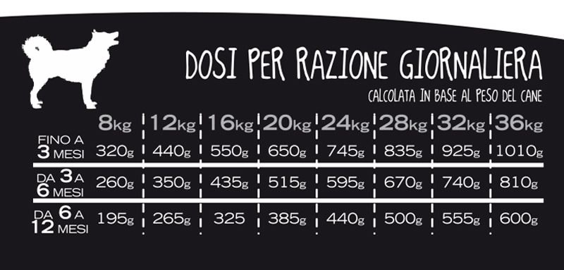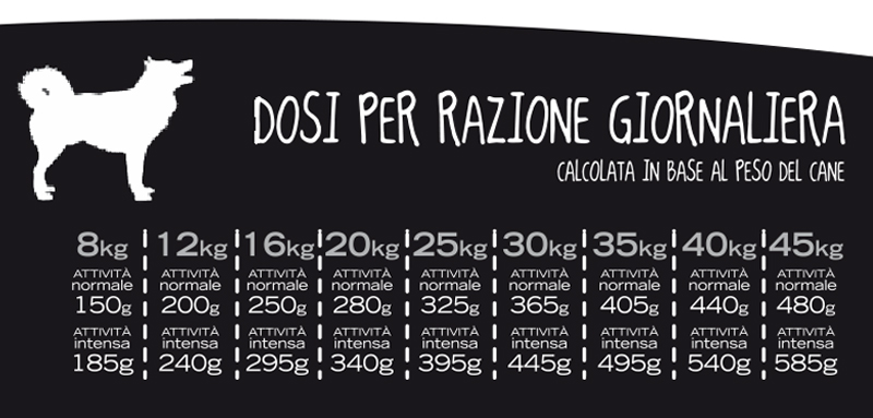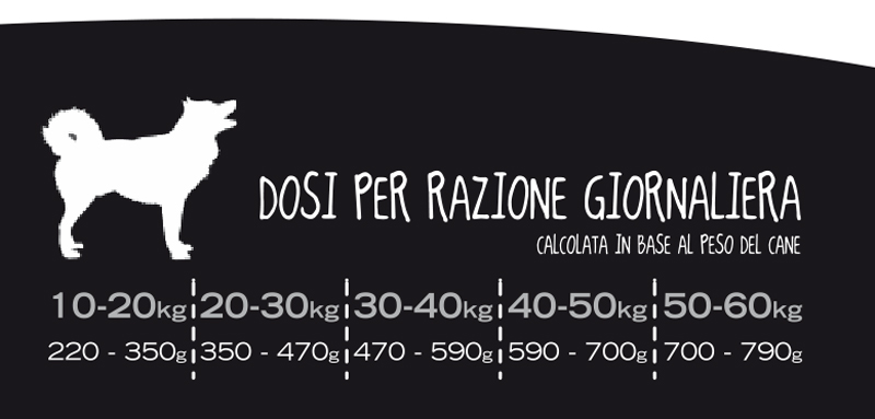 Umidità 8%, Proteina 22%, Oli e grassi grezzi 8%, Ceneri grezze 9,5%, Fibra grezza 3%.